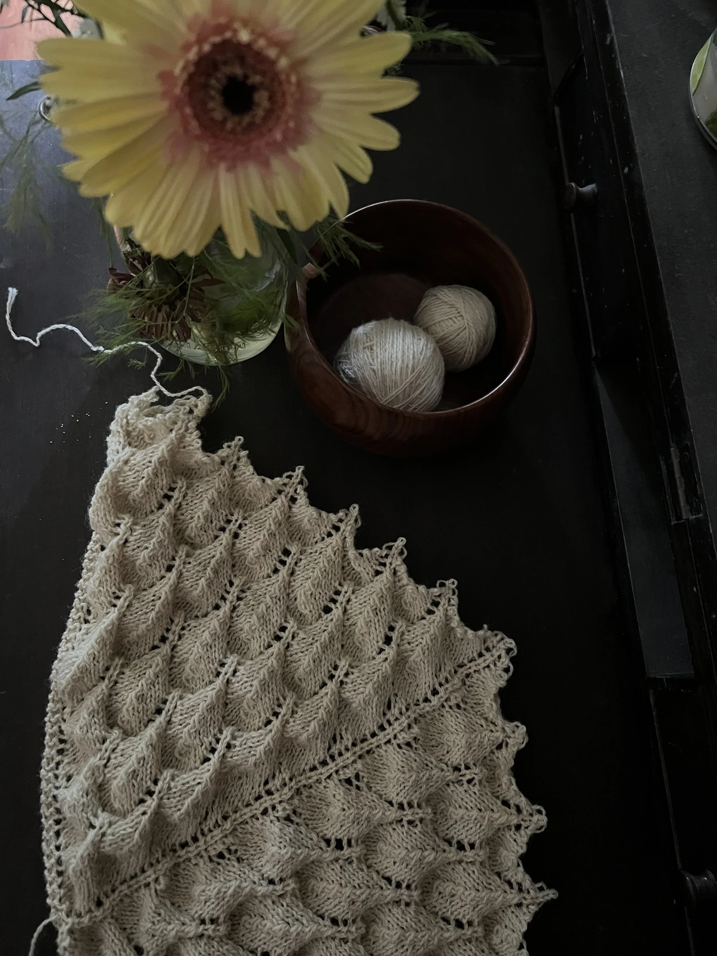 Earlier this month, I posted a photo on my Facebook page (give Treehouse a follow if you aren’t already!) of a lace shawl I was working on, featuring a design of my own tinkering. I was fresh off of finishing up the Wild Vines Blackberry Shawl, which I teased in my previous blog post (that shawl drops on September 1, unless it sells at the public market this weekend!) and feeling VERY confident about my ability to start experimenting more with lace.